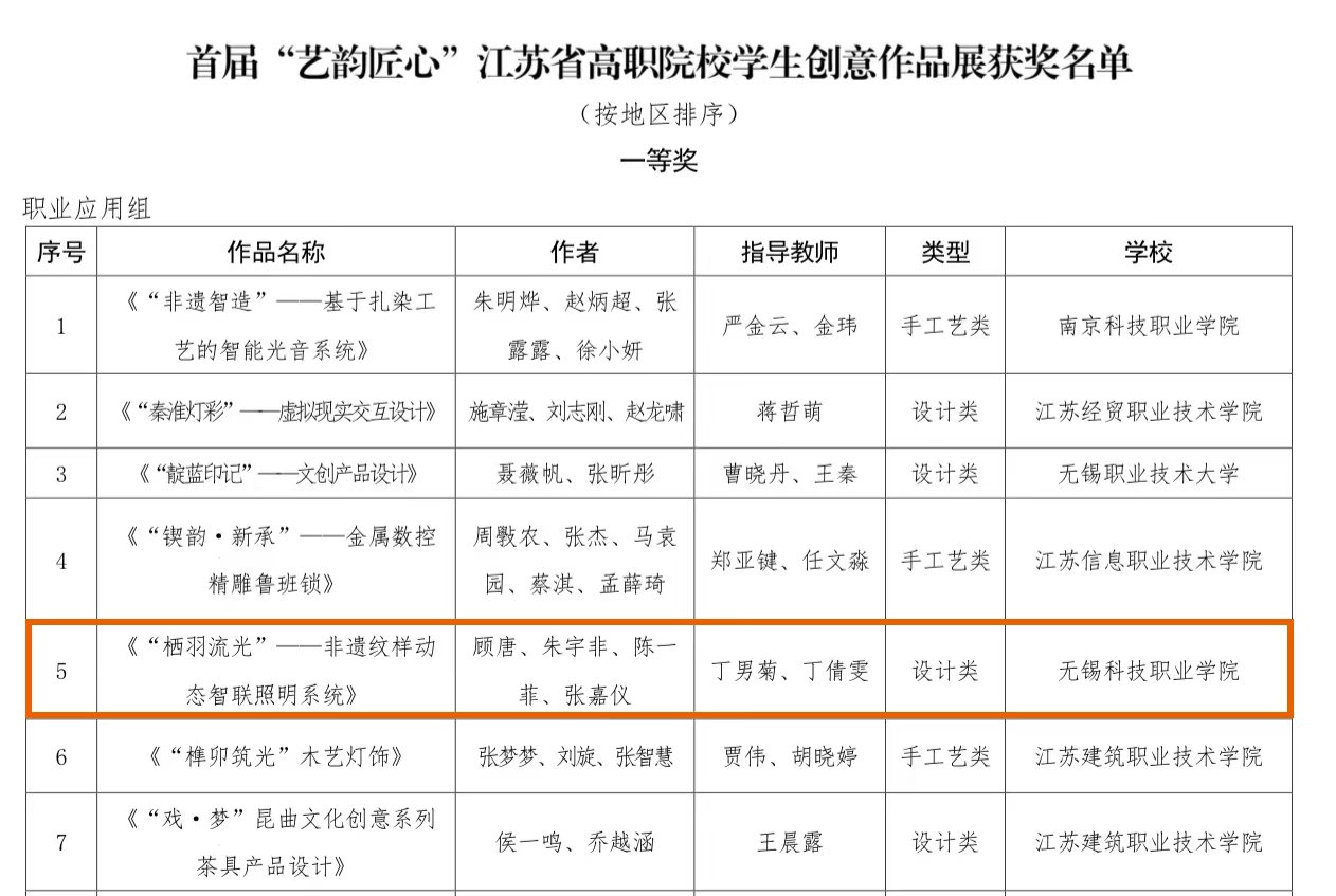 近日,由省教育厅主办的首届“艺韵匠心”江苏省高职院校学生创意作品展在徐州艺术馆成功举办,我们党委副书记韩宁带队参展。前期,校团委和二级学院共同推进,精心指导项目选题、研发、制作和布展。经过积极筹备,我们师生从全省72所高职院校的447件作品中突围,勇夺一等奖。