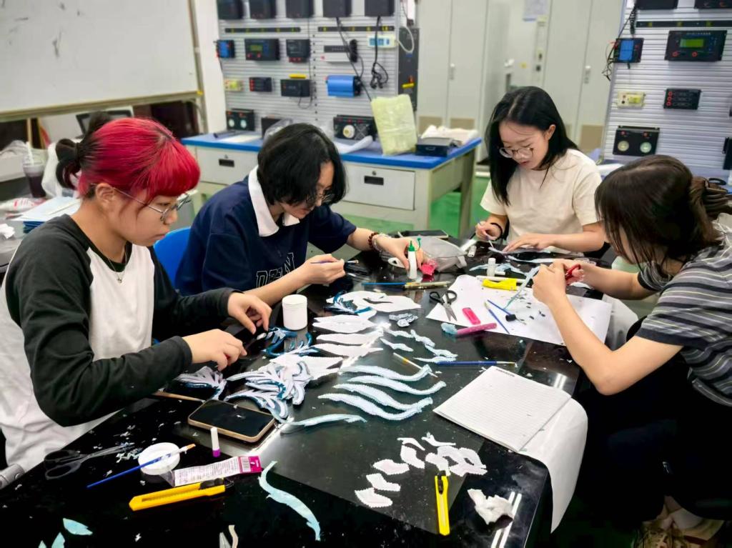 获奖作品《栖羽流光——非遗纹样动态智联照明系统》由我们集成电路学院电子信息技术系丁男菊、丁倩雯老师指导,顾唐、朱宇非、陈一菲、张嘉仪同学共同创作。团队创造性地复现了千年传承的古法拼布工艺,将珍贵的非遗宋锦残片经过描摹、剪裁等多达十余道工序,分色重组为羽状纹样,层叠拼贴于冰绡之上。整灯共包含312个手工贴片,最终在光影投射下,形成群鹤翩跹的灵动意象,深刻诠释了文化传承与节能环保的双重价值。同时,该装置集成了高精度毫米波雷达感应、仿生机械臂驱动、声光协同及手机APP远程交互等先进技术,实现了传统美学与智能生活的无缝连接,以其文化融合的创新性、交互技术的突破性及鲜明的节能环保特色,赢得了评委与观展师生的一致好评。