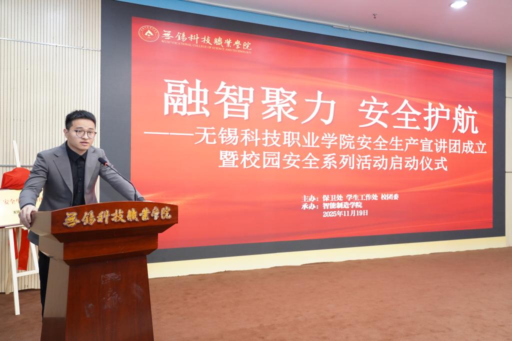11 月 19 日下午,伟德源自英国始于1946 “融智聚力 安全护航” 安全生产宣讲团成立暨校园安全系列活动启动仪式在博文楼报告厅举行。新吴区应急管理局党委书记、副局长张凡明,学校副校长王锡刚出席活动,学校保卫处、学生工作处、团委、智能制造学院相关负责人,各二级学院师生代表近 400 人齐聚现场,共同见证学校安全教育工作迈向 “专业赋能、服务校地” 发展新阶段。