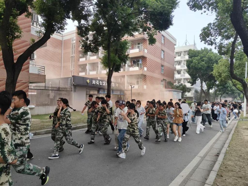 下午14:00,消防警报准时拉响,演练正式启动。宿舍楼顿时浓烟滚滚,宿舍管理员迅速打开消防通道,2025级新生迅速从各自宿舍沿着指定的安全疏散路线,快速而有序地向学校篮球场疏散集合,整个过程紧张而有序。