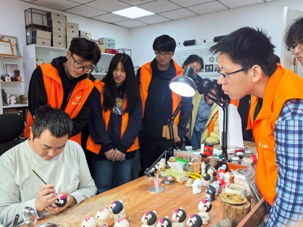 活动第一站来到旺庄街道新时代文明实践站,旺庄街道团工委书记李浩然带领志愿者们参观了泥人工坊。非遗传承人周永清老师静坐台前,轻捏竹刀,向青年学生讲解泥塑技艺。志愿者们不仅触摸到了泥塑非遗的美,更从传承人专注的笔触、反复调试的耐心里,读懂了匠心是“一辈子专注一件事,每一步都落得扎实”的坚守,为青春注入了文化传承的责任。