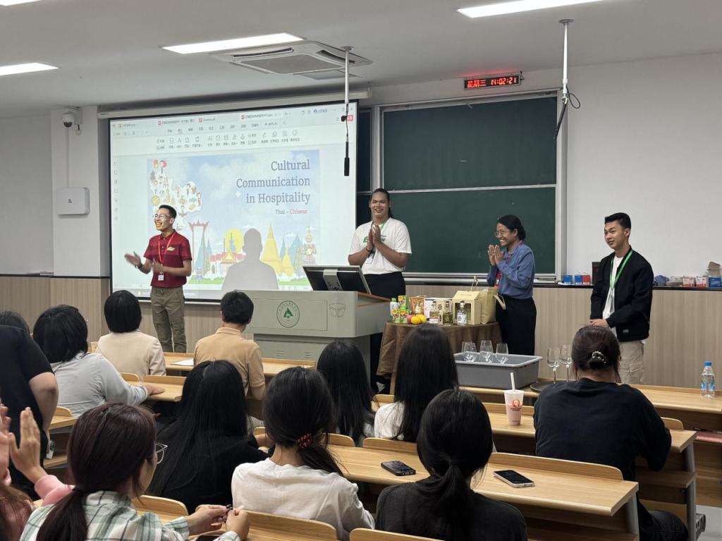 10月15日,泰方尼塔亚老师为我们师生带来了《跨文化沟通与酒店服务》专题讲座,深入阐释了泰国“微笑服务”的精髓。讲座中,中泰学生携手进行创意鸡尾酒制作,选用中泰两地特色食材,寓意着两校合作的融合与创新。10月29日,中泰学生专业交流活动精彩纷呈,双方学生通过PPT展示、自由讨论等交换专业学习心得和中泰文化,共同协作完成中餐摆台与礼仪展示,在专业实践与文化交流中深化了理解,缔结了友谊。