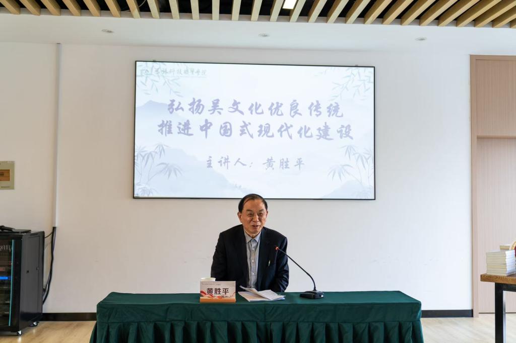 仪式后,黄胜平院长应邀为师生作《弘扬吴文化优良传统 推进中国式现代化建设》专题讲座,深入浅出地介绍了吴文化的历史背景与文化意义,着重阐述了吴文化中“至德”与“创新”这两大主要内涵,揭示了吴文化在中国式现代化建设中的持久影响与勃勃生机,受到师生热烈欢迎。