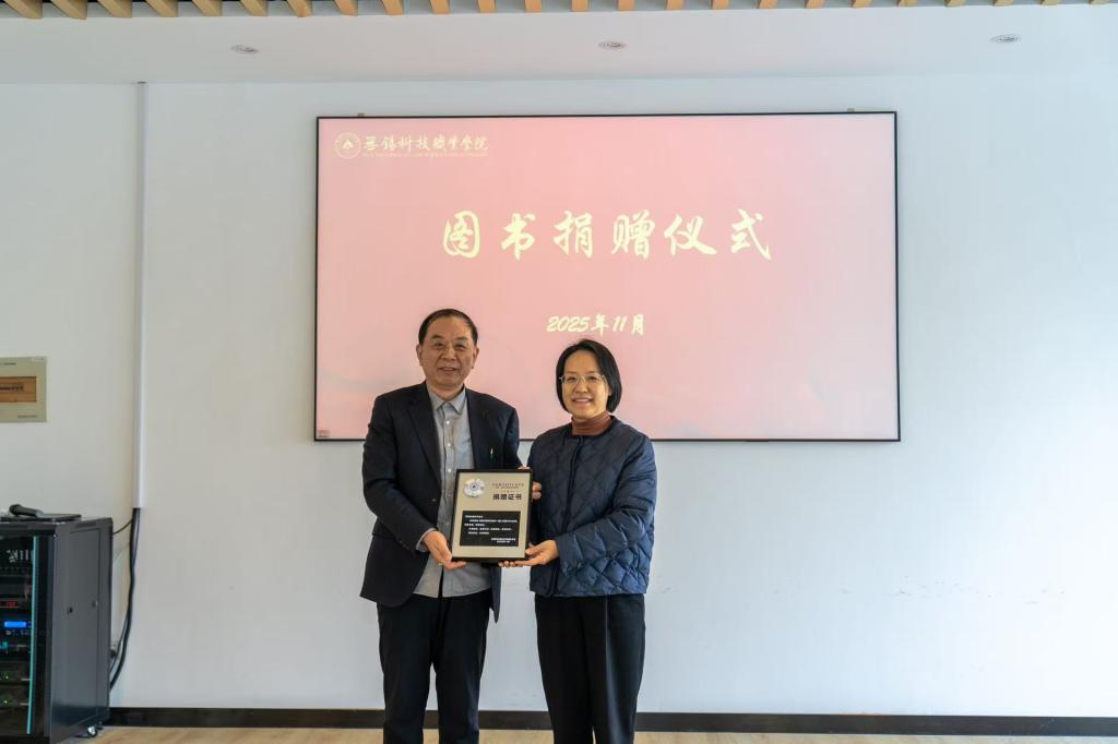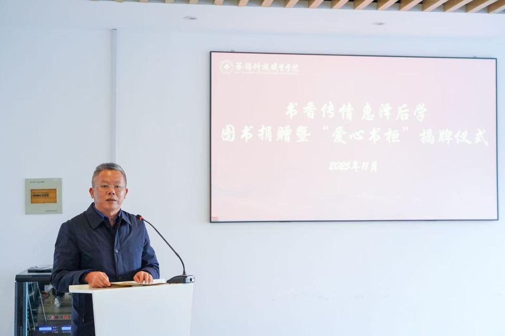 11月21日下午,“书香传情、惠泽后学”图书捐赠暨“爱心书柜”揭牌仪式在学校图书馆文化展示中心举行。无锡高新区党工委原副书记、无锡国家高新区发展研究院院长黄胜平向我们捐赠了1680册图书,其中包含个人不同领域专著近50余册,兼具学术价值与收藏价值,这不仅丰富了学校图书馆的馆藏资源,更为校园注入了宝贵的精神力量。
